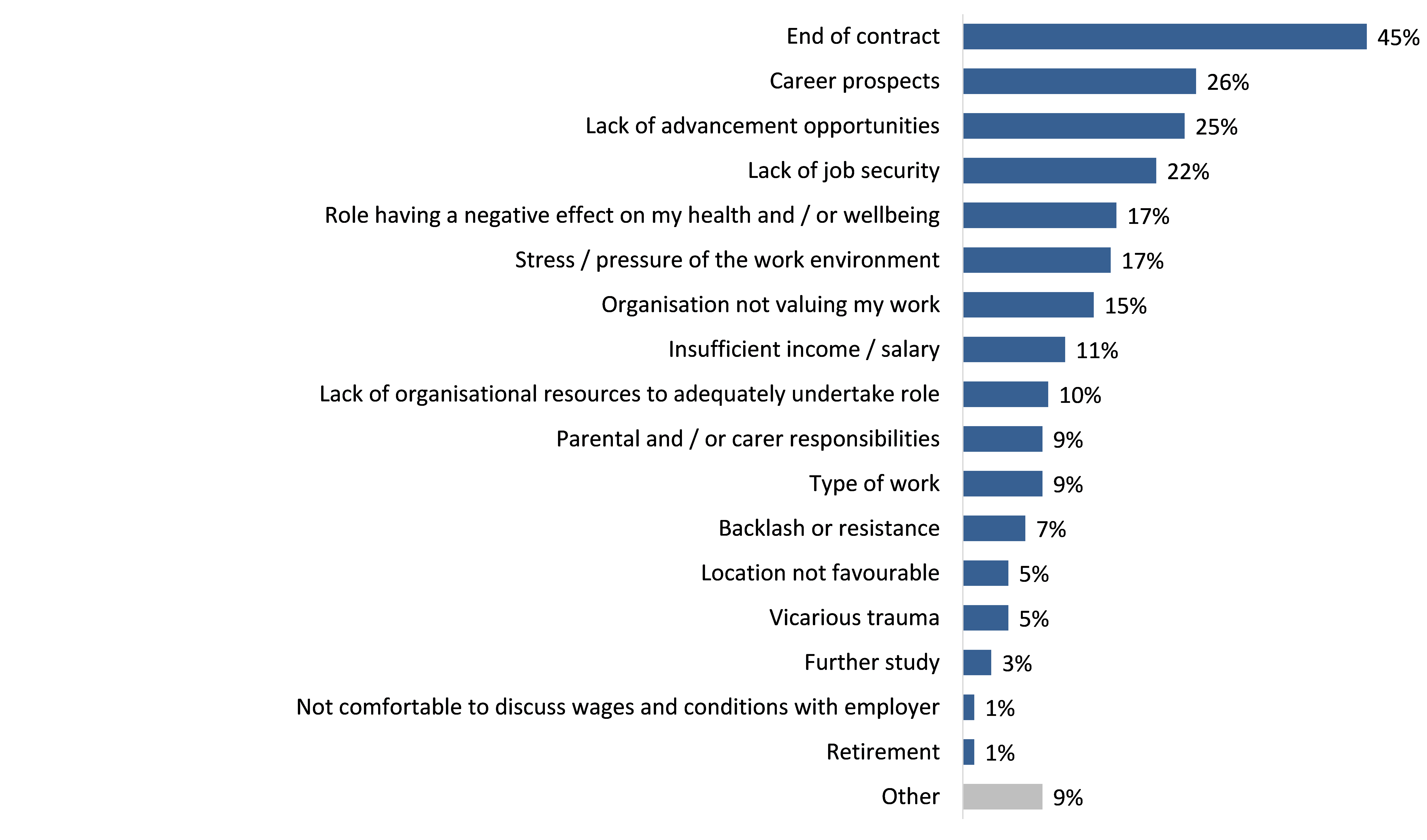 Regarding future intentions, almost half of all primary prevention practitioners reported that they had plans to leave their current role. Although many planned to do so due to an end of contract, others were influenced by better career prospects and lack of advancement opportunities.