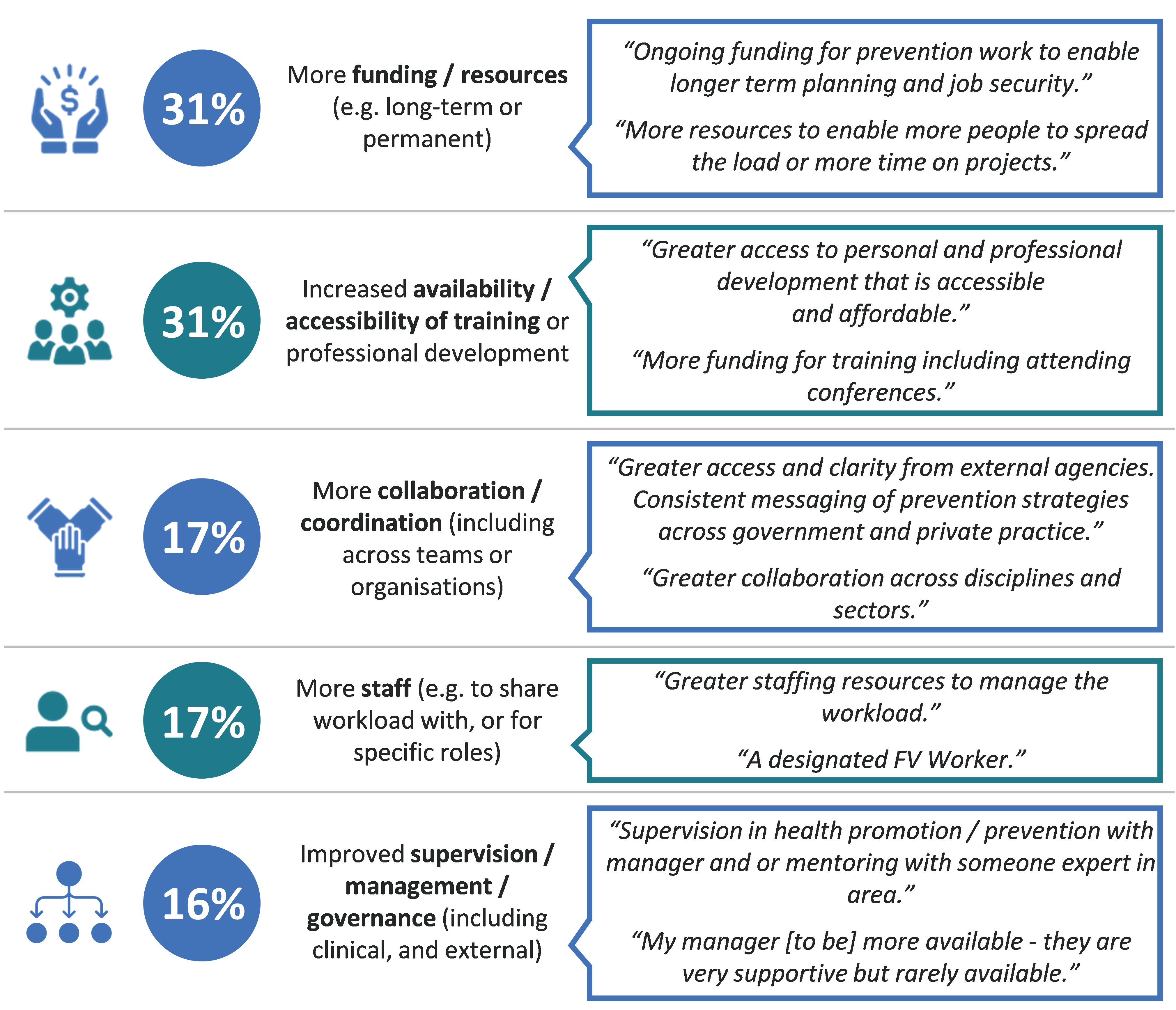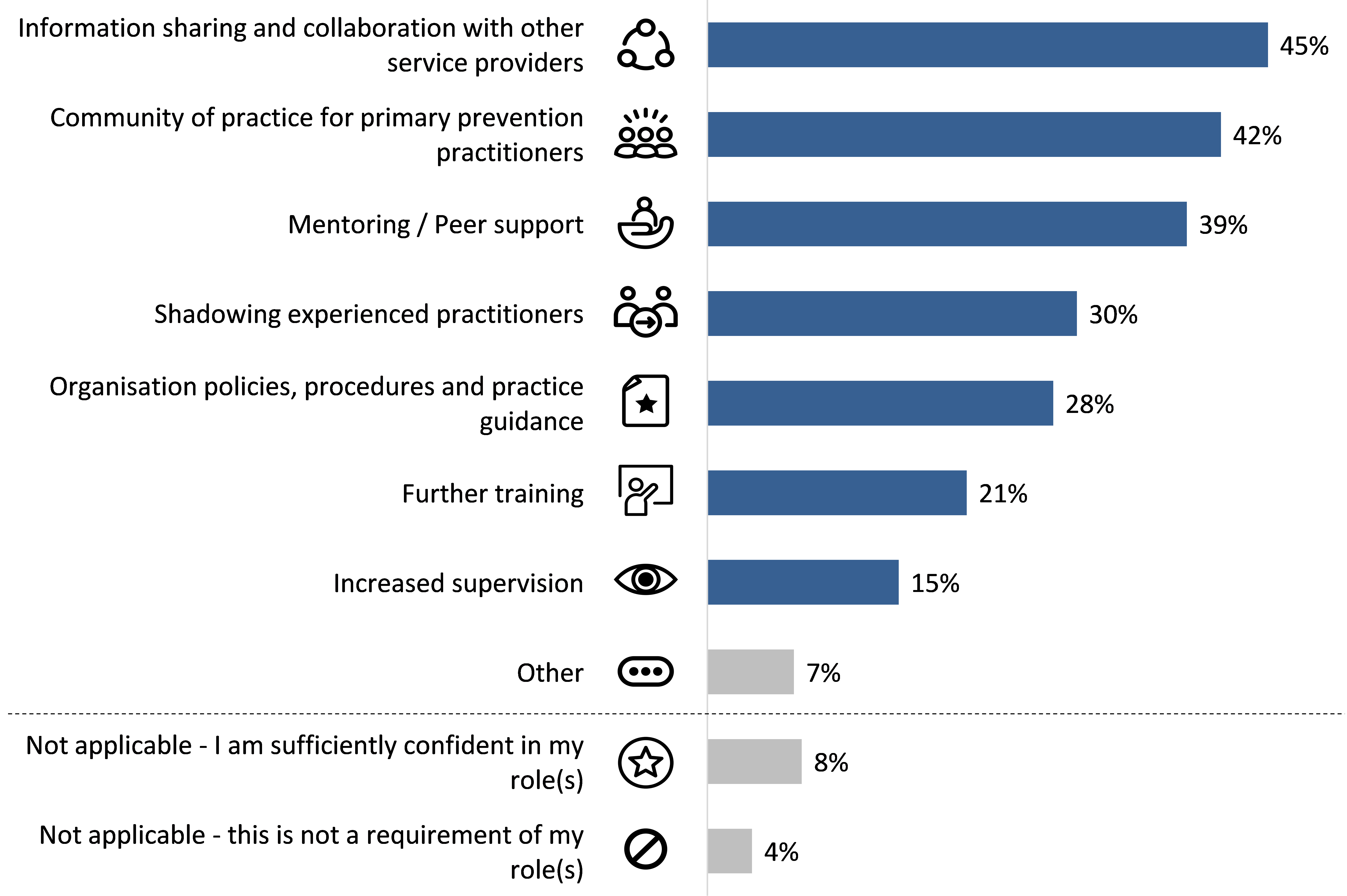 The primary prevention workforce felt that the following additional support would be most useful in increasing their confidence in performing their role(s) (see Figure 10):