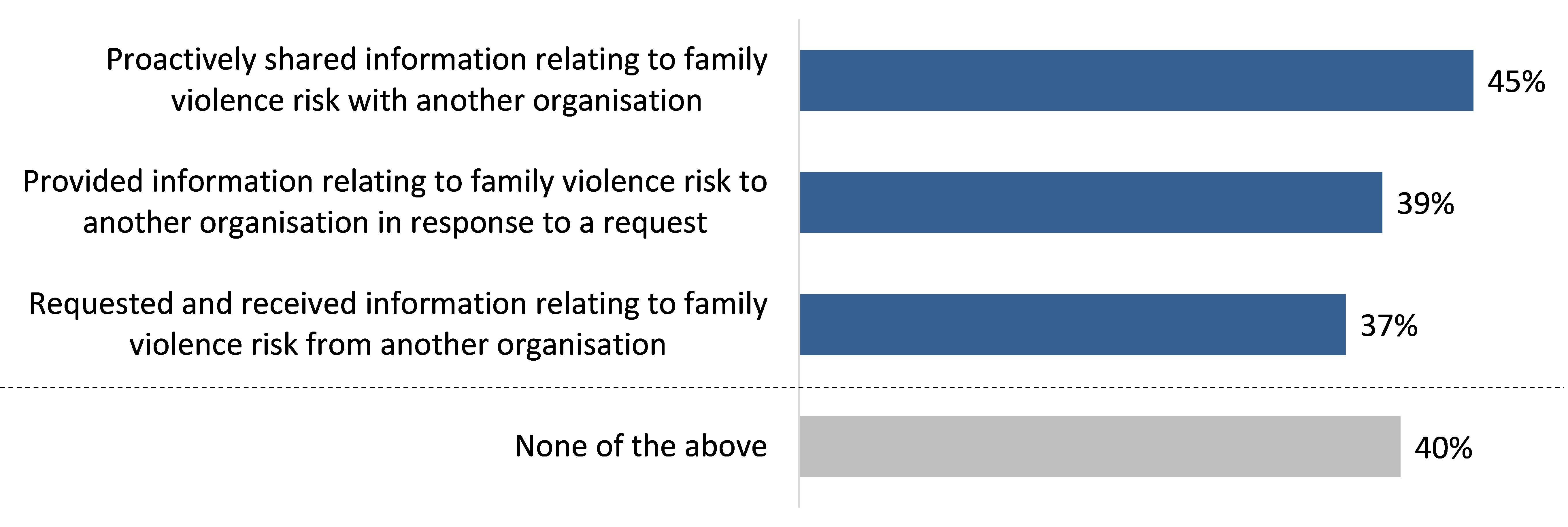 - two-in-five indicating that they had not undertaken any information sharing activities under the FVISS in the past year (40%).