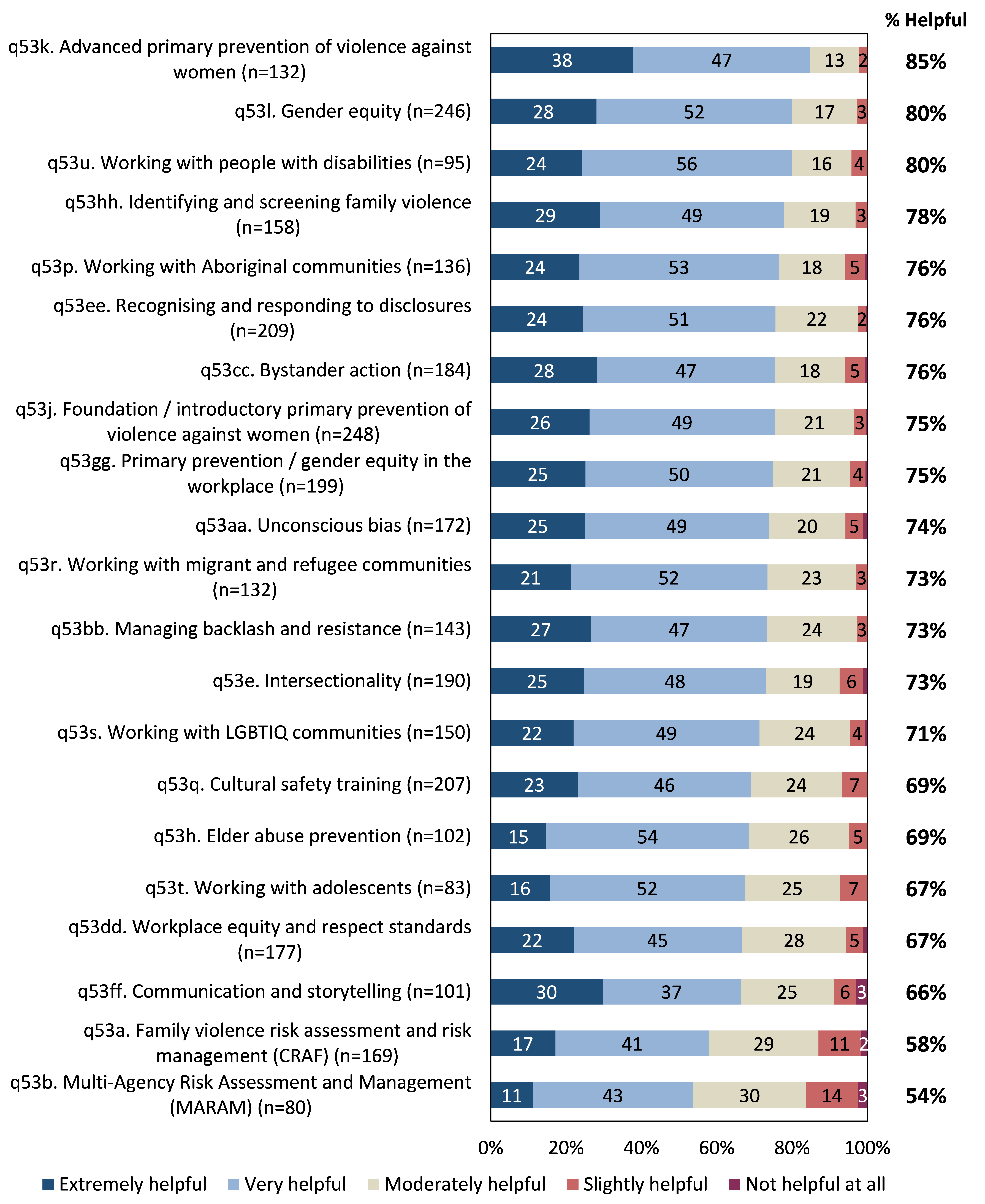 - advanced primary prevention of violence against women (85% found training in this topic to be ‘extremely’ or ‘very’ helpful);