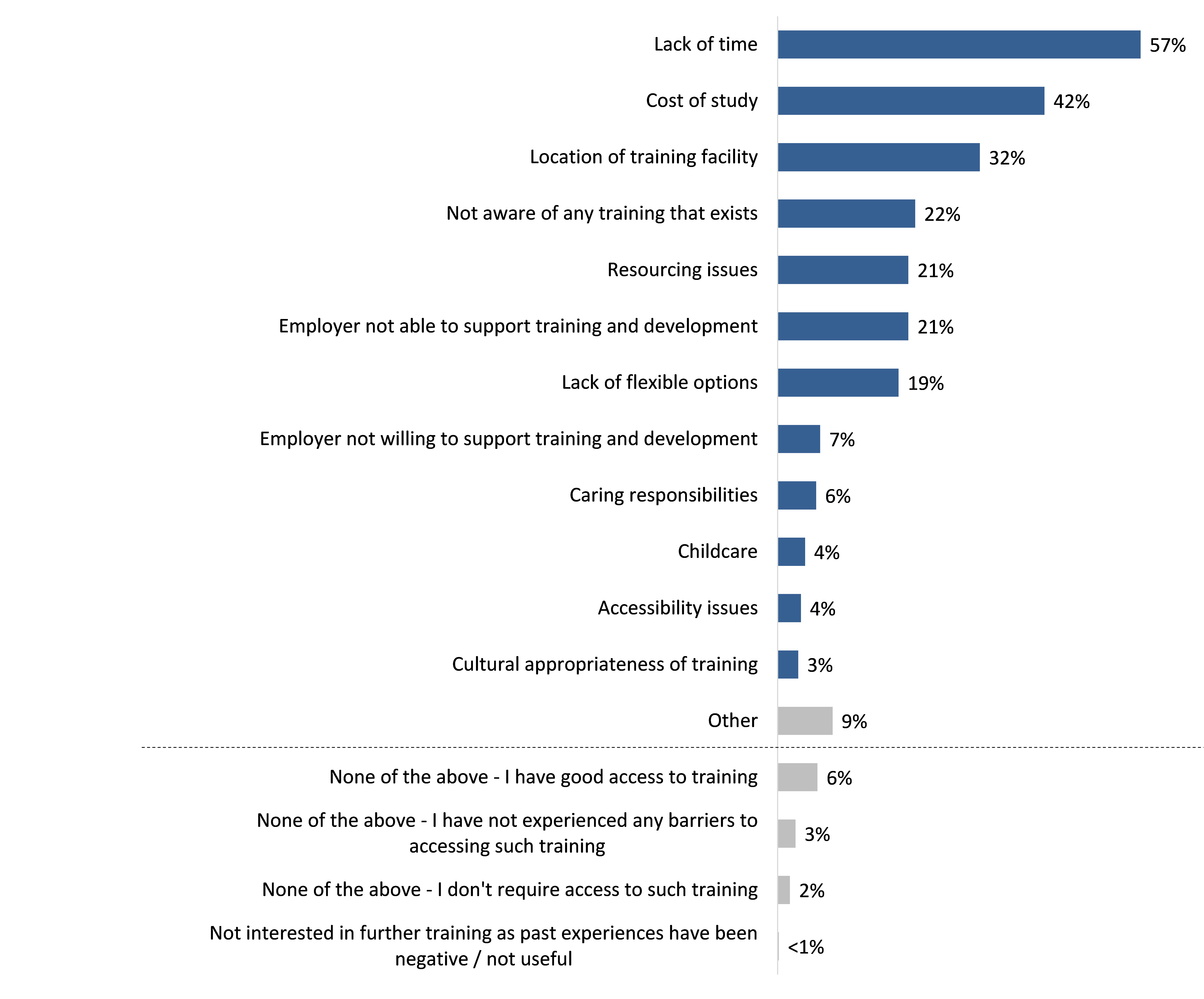 In terms of barriers to accessing further training and development, lack of time was the most commonly reported barrier, followed by cost of study and location of training facility.