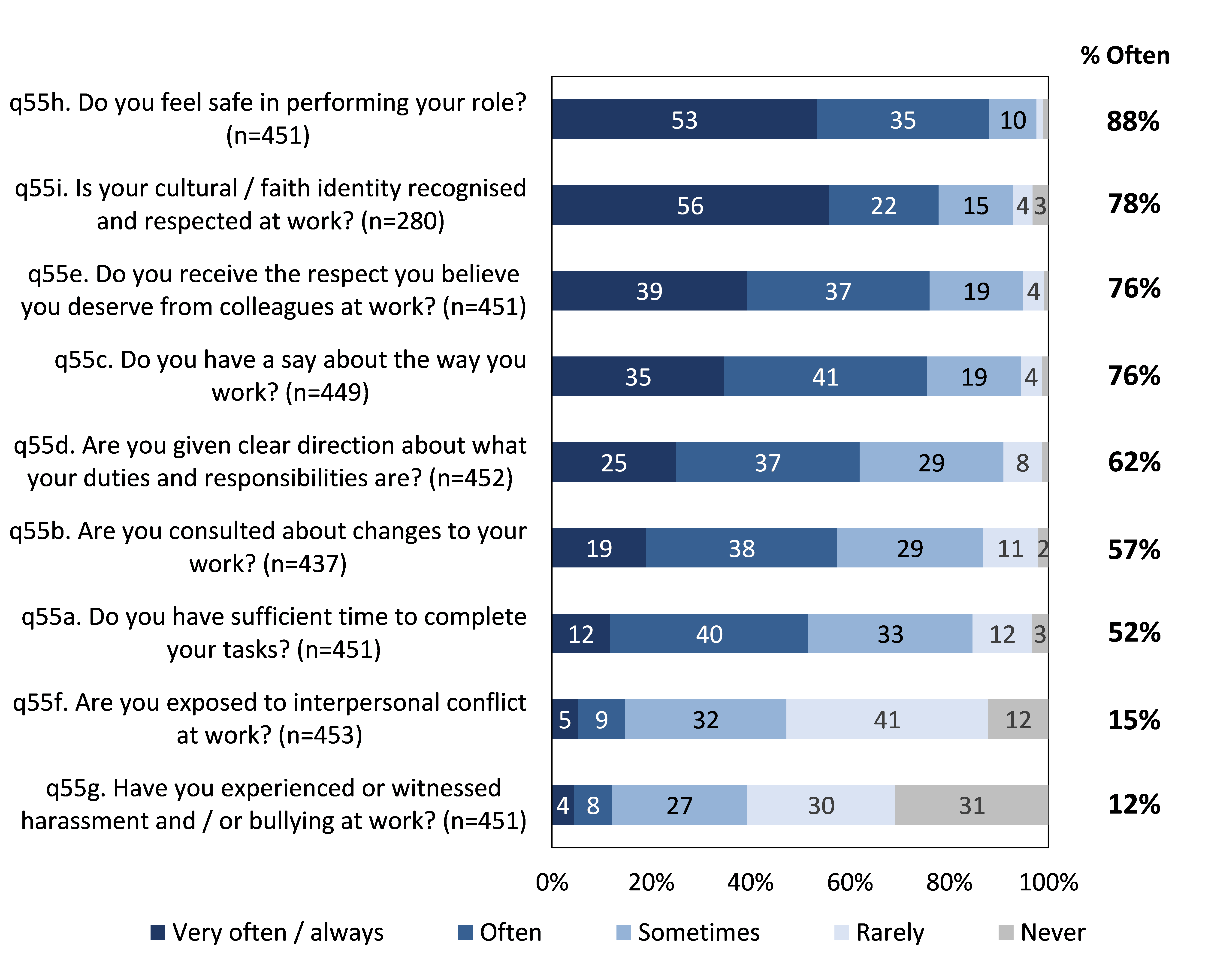 Positive findings included the fact that most of the workforce indicated that they felt safe in performing their role, and many felt respected and fairly consulted when undertaking their work. Additionally, few were dissatisfied in their current role and most felt that they made a difference to people affected by family violence (45% felt they made a significant difference).