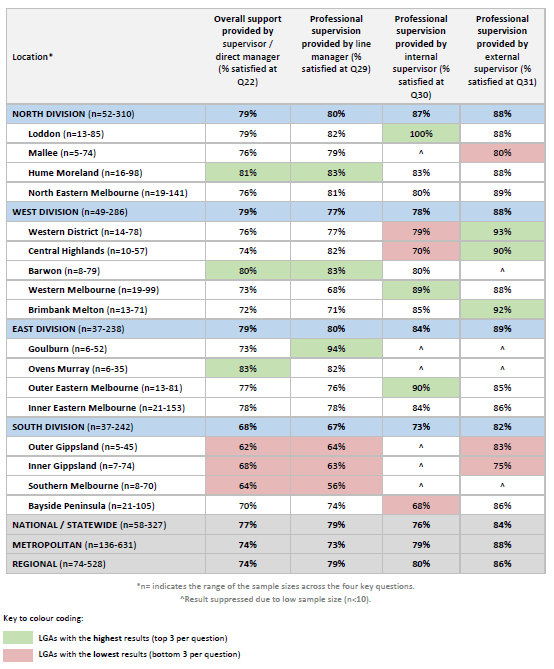 Overall, the results indicated that workers in the specialist family violence response workforce were satisfied with the quality of support provided to them by their supervisor or direct manager, and that having the opportunity to regularly discuss both their work and their professional development were key drivers of this satisfaction.