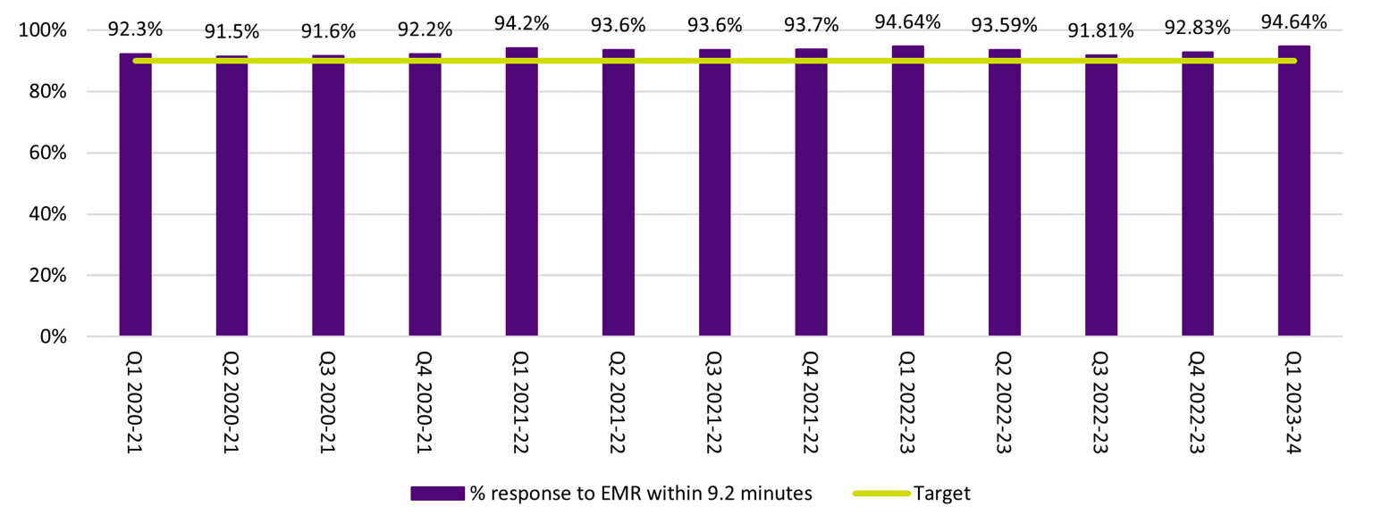 FRV continues to achieve its target for percentage of response to EMR within 9.2 minutes (measure 2.1.3a) in FRV districts. FRV reported a result of 94.64 per cent and has met the target of 90 per cent over 13 consecutive quarters, which is a good result for the community (see Figure 1). FSIM notes that FRV recorded 1511 EMR incidents in FRV districts (measure 1.3.1).