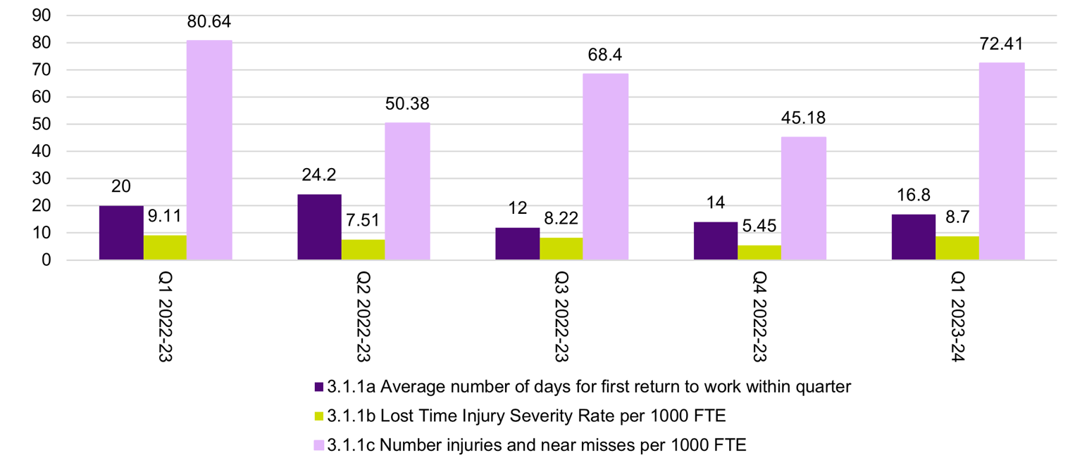 Additionally, FSIM notes that FRV continues to record an increase on the average number of days for return to work (3.1.1a) with a Q1 result of 16.8 days. This is an increase from 12 days in Q3 2022-23 and 14 days in Q4 2022-23.