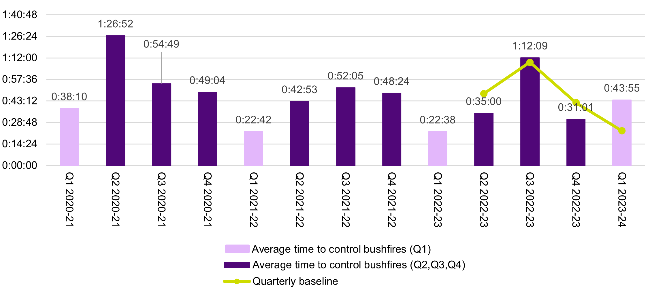CFA advise that a wet or dry season, along with early or late seasonal onset, can influence the result for this metric (both overall baseline and quarterly baseline). CFA report that Q1 this year has seen a move into an early fire season with dry conditions, which is different to Q1 in 2021 and 2022. CFA advised that this may account for a level of quarterly variation.