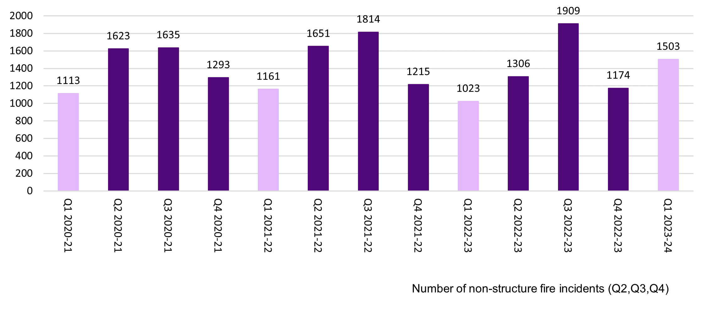 FRV responded to 1,503 incidents (categorised as preventable non-structure fire incidents) in FRV districts in Q1 2023-24 (1.3.3a). This is an increase of 329 (21.89 per cent) when compared to Q4 2022-23.