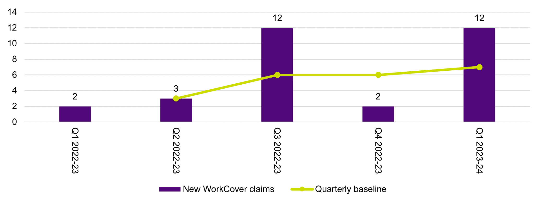 CFA reported 12 new WorkCover claims this quarter (indicator 3.1.4). This is a significant (83 per cent) increase from the Q4 2022-23 result of two claims and the year-on-year Q1 2022-23 result of two claims (see Figure 9). CFA report that new employee claims continue to increase, with mental health claims accounting for 50 per cent of all new employee claims. CFA advised FSIM that further investigation is required to determine if there are any systemic factors leading to these increases.