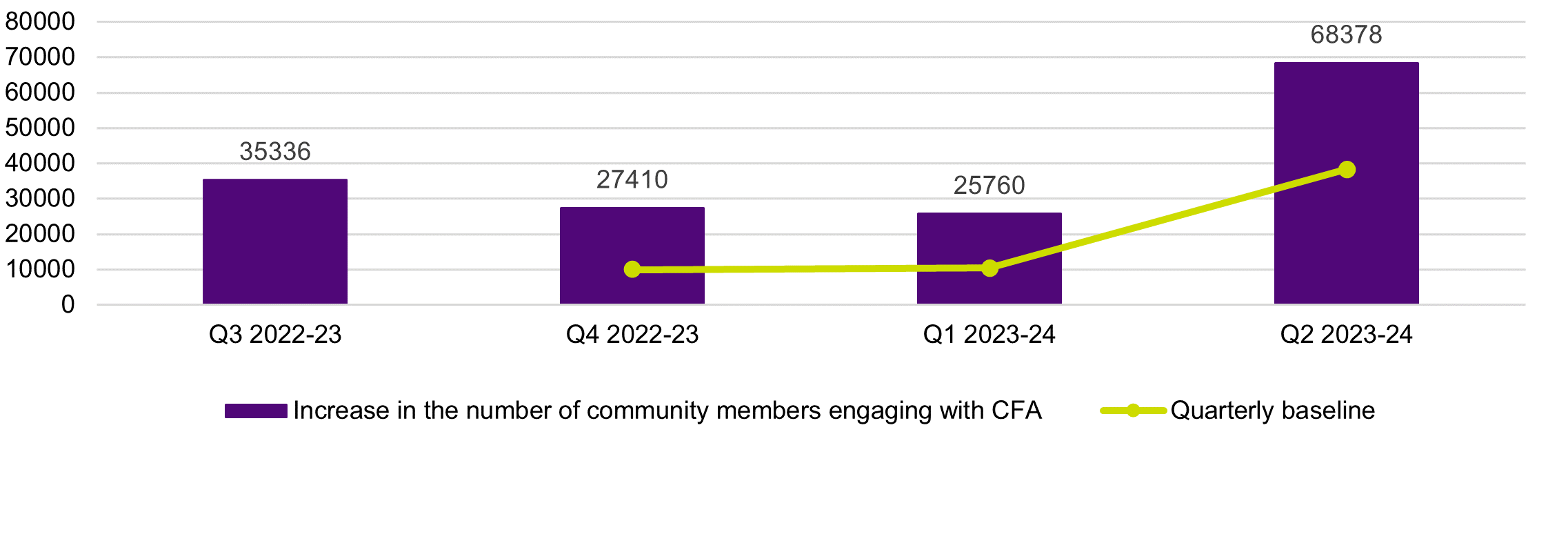 - CFA increased its community engagement by 165 per cent since last quarter, engaging with 68,378 community members through a range of forums including fire safety planning workshops, community events and school education programs.