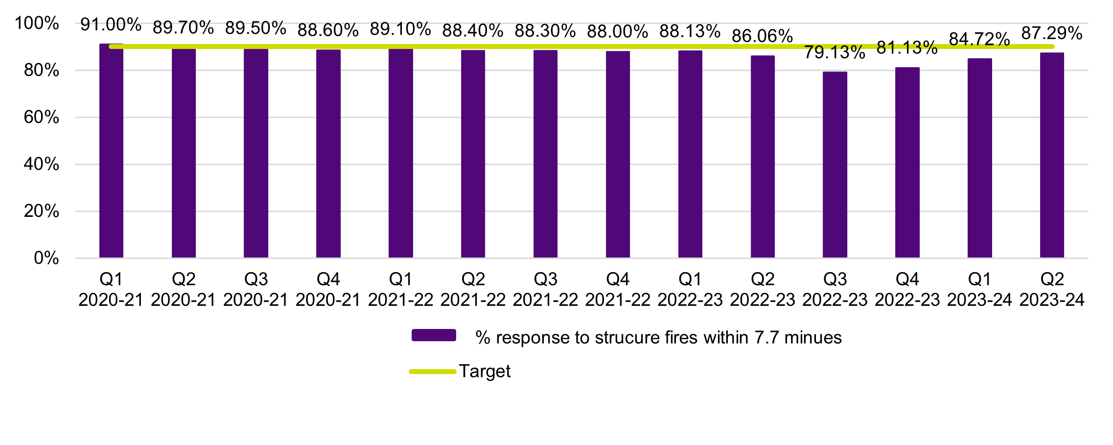 For the thirteenth consecutive quarter, FRV did not meet their target for this measure (90 per cent), recording a result of 87.29 per cent for response times to structure fire incidents within 7.7 minutes (Figure 3).