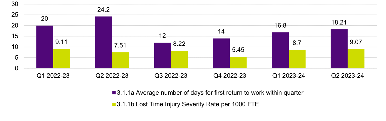 FRV continues to record reduced performance in measures ‘3.1.1a Average number of days for first return to work within quarter’ and ‘3.1.1b lost time injury severity rate per 1000 FTE’.