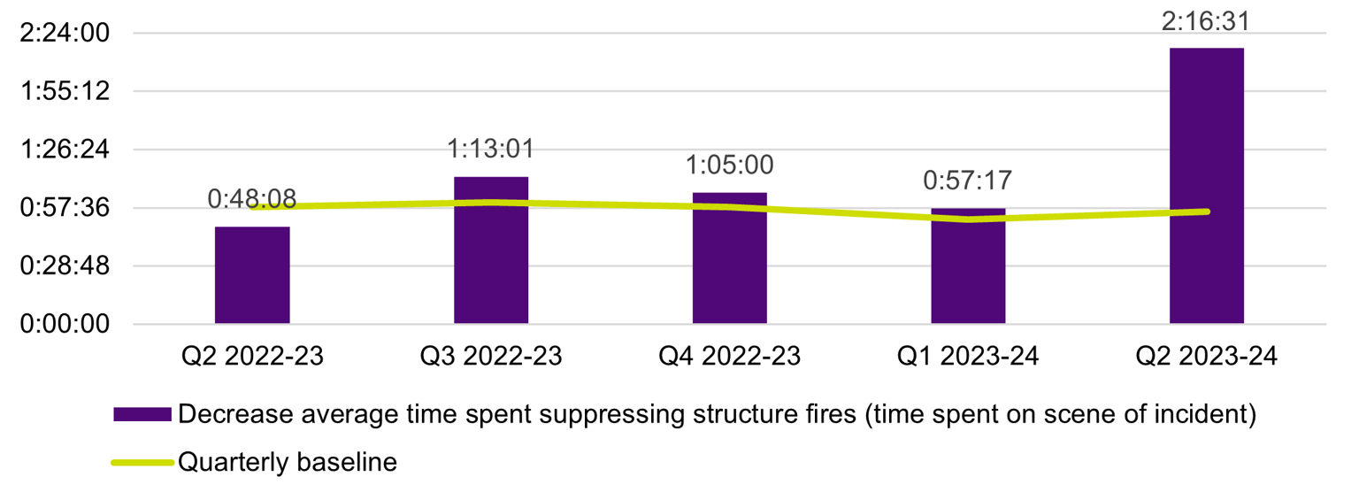 - CFA did not meet their quarterly baseline of 55 minutes and thirty-five seconds for the indicator ‘decrease average time spent suppressing structure fires’, recording a result of 136 minutes and 31 seconds this quarter.