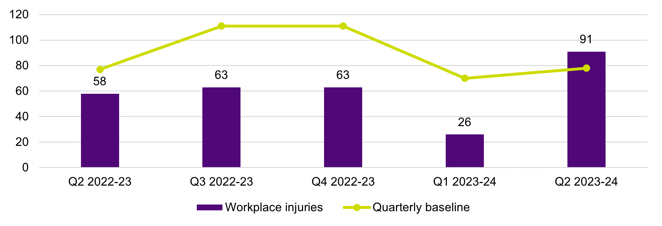 CFA reported 91 workplace injuries this quarter. This represents a 16.7 per cent increase on the quarterly baseline of 78 and a significant change from the previous quarter’s result (Figure 6).