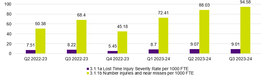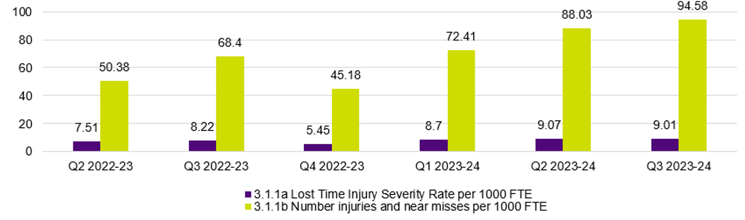 Measure ‘3.1.1b: Number of injuries and near misses per 1000 FTE’, FRV recorded a result of 94.59 this quarter compared to 88.03 in Q2 2023-24 (Figure 5). This is the highest recorded result for this measure. FRV report that the increase of injuries from over Q1 and Q2 2023-24 are in part related to psychological exposure reports which are now classified as incidents/injuries rather than hazards.
