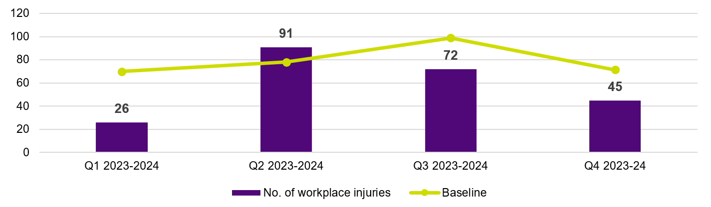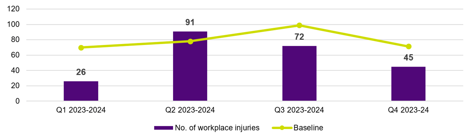 This is an improvement on the Q3 result of 72 workplace injuries against a quarterly baseline of 99 (Figure 5).