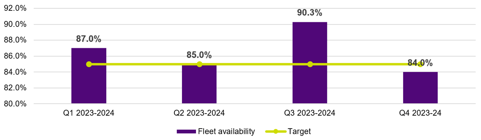 FRV recorded a result of 84 per cent fleet availability for metro-only appliances this quarter. This is 1 per cent short of FRV's target and 6 per cent lower than the Q3 result of 90.3 per cent. FSIM further notes that the overall annual result for this measure is 87 per cent for 2023-24.