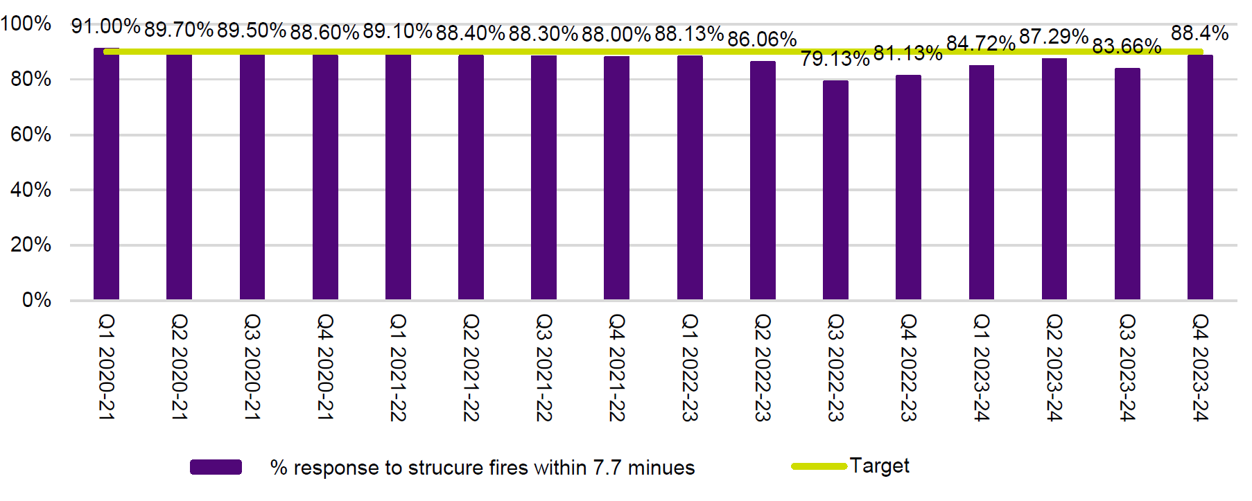 - FRV: Percentage of response to structure fire incidents within 7.7 minutes (target 90 per cent) (measure 2.1.3a).
