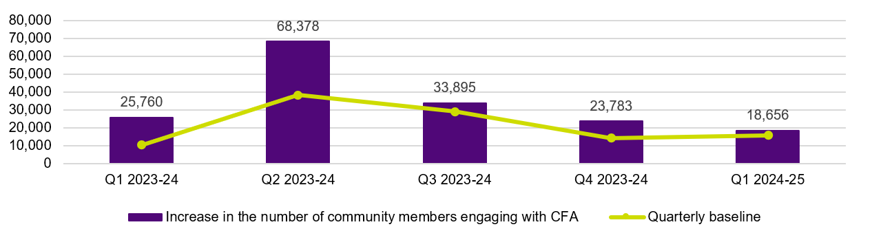 CFA has consistently exceeded the baseline for the number of community members it engages each quarter. This quarter’s result exceeds the baseline by 17 per cent (Figure 1 below).