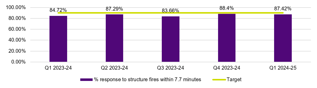 For the sixteenth consecutive quarter, FRV did not meet its target for responding to 90 per cent of structure fire incidents within 7.7 minutes. FRV reported a result of 87.42 per cent this quarter (Figure 4 below).