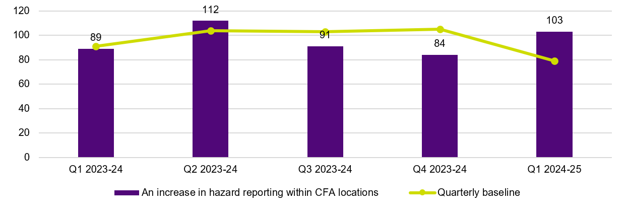 CFA recorded a result of 103 hazards reported this quarter. This represents a significant increase of 30 per cent over the quarterly baseline of 79 and a 23 per cent increase compared to the previous quarter.