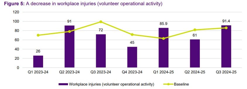 - CFA: A decrease in workplace injuries (volunteer operational activity) (indicator 3.1.2) – Q3 results demonstrated a significant increase against the quarter 2 (Q2) results for this indicator, which reflect a negative change outcome. Note that for this indicator, the CFA deems a lower result as desirable.