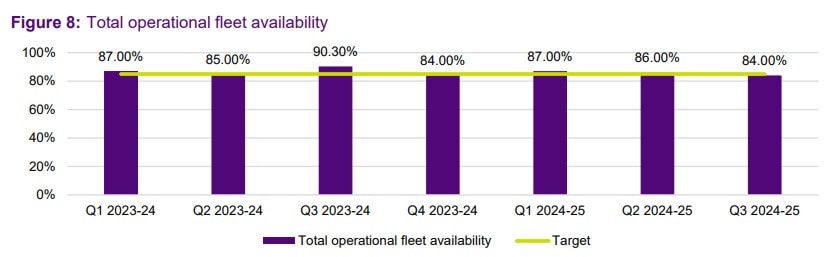 FRV did not meet its target for total operational fleet availability this quarter, reporting a result of 84%. This is 1% below the target of 85% and slightly lower than the results from the previous 2 quarters (Figure 8).