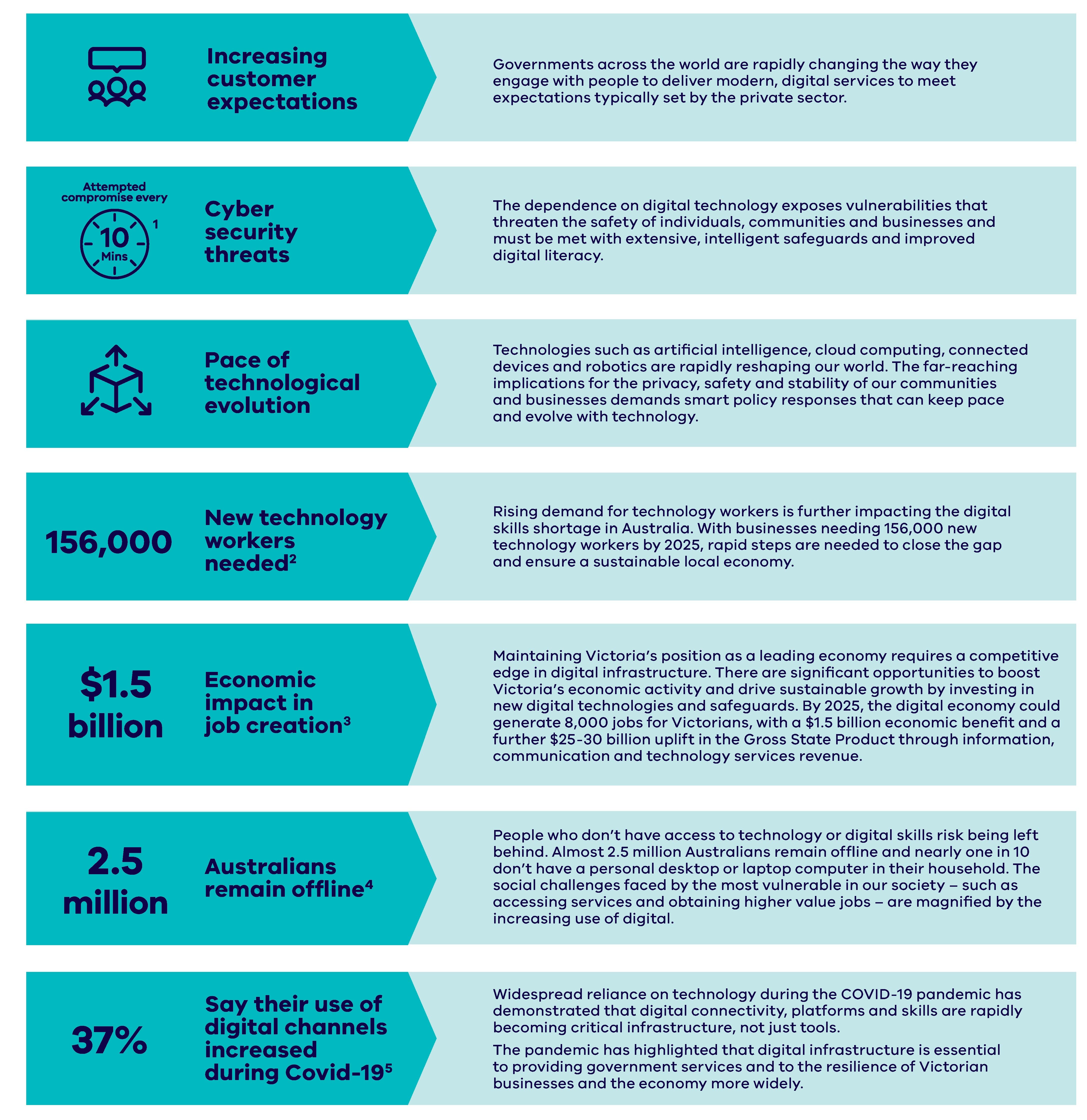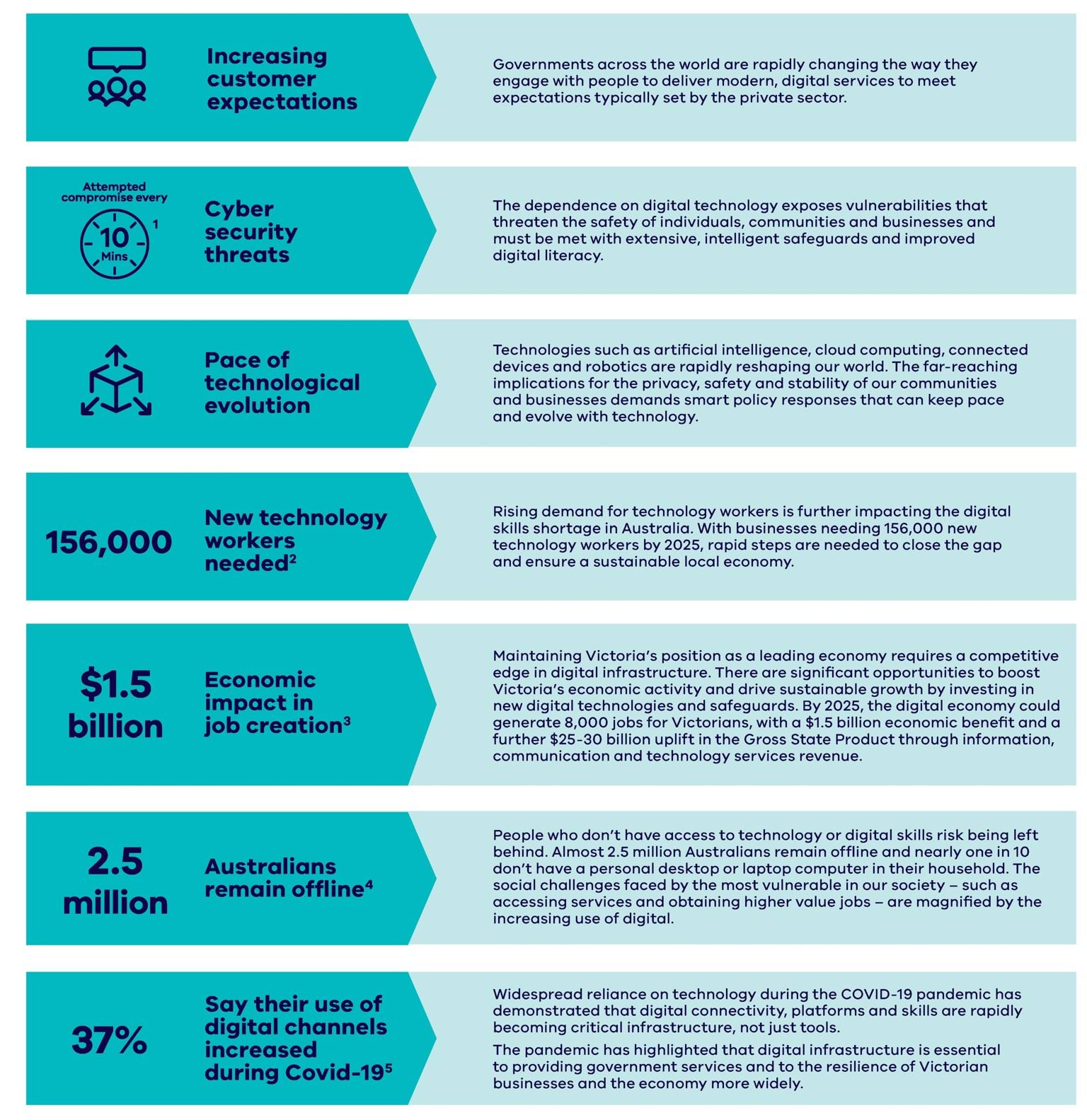 37% of Australians surveyed say their use of digital channels increased during Covid-195: Widespread reliance on technology during the COVID-19 pandemic has demonstrated that digital connectivity, platforms and skills are rapidly becoming critical infrastructure, not just tools. The pandemic has highlighted that digital infrastructure is essential to providing government services and to the resilience of Victorian businesses and the economy more widely.
