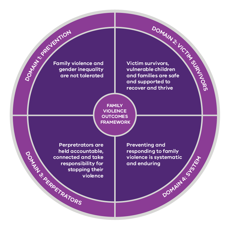 The Family Violence Outcomes Framework (the Outcomes Framework) translates our vision of a Victoria free from Violence, outlined in our 10-year Plan, into a framework that will enable us to measure and understand the impacts of our efforts.