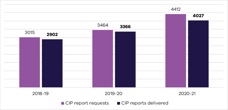 The Central Information Point continues to respond to demand from The Orange Door in existing areas and as the network expands across Victoria. The number of Central Information Point reports delivered annually has increased from 2,902 in 2018–9 to 4,027 in 2020–21 (a 39 per cent increase).