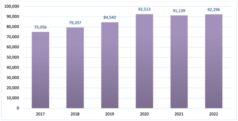 Reports of family violence appear to be plateauing, but they remain 23 per cent higher than in 2017, having increased from 75,056 reports in 2017 to 92,296 reports in 2022.