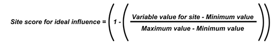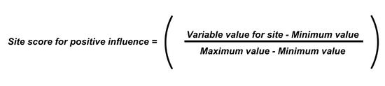 Positive influence means that the higher the value of the variable, the greater its effect on the score. This is calculated as the variable value for a site minus the minimum value for that variable, divided by the range of values (Equation 1).