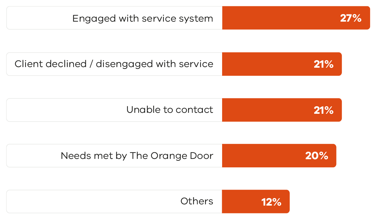The Orange Door network ends involvement with an individual or family for several reasons. These can include where the person’s needs are met within The Orange Door, the person is connected to a service that they need, the person decides not to engage with The Orange Door or the person could not be contacted despite multiple attempts by The Orange Door practitioner. In a minority of cases, where an unacceptable or unmanaged risk remains (such as to a child), The Orange Door network practitioners will escalate the matter to statutory or emergency services. Wherever possible, this is done in collaboration with the client.