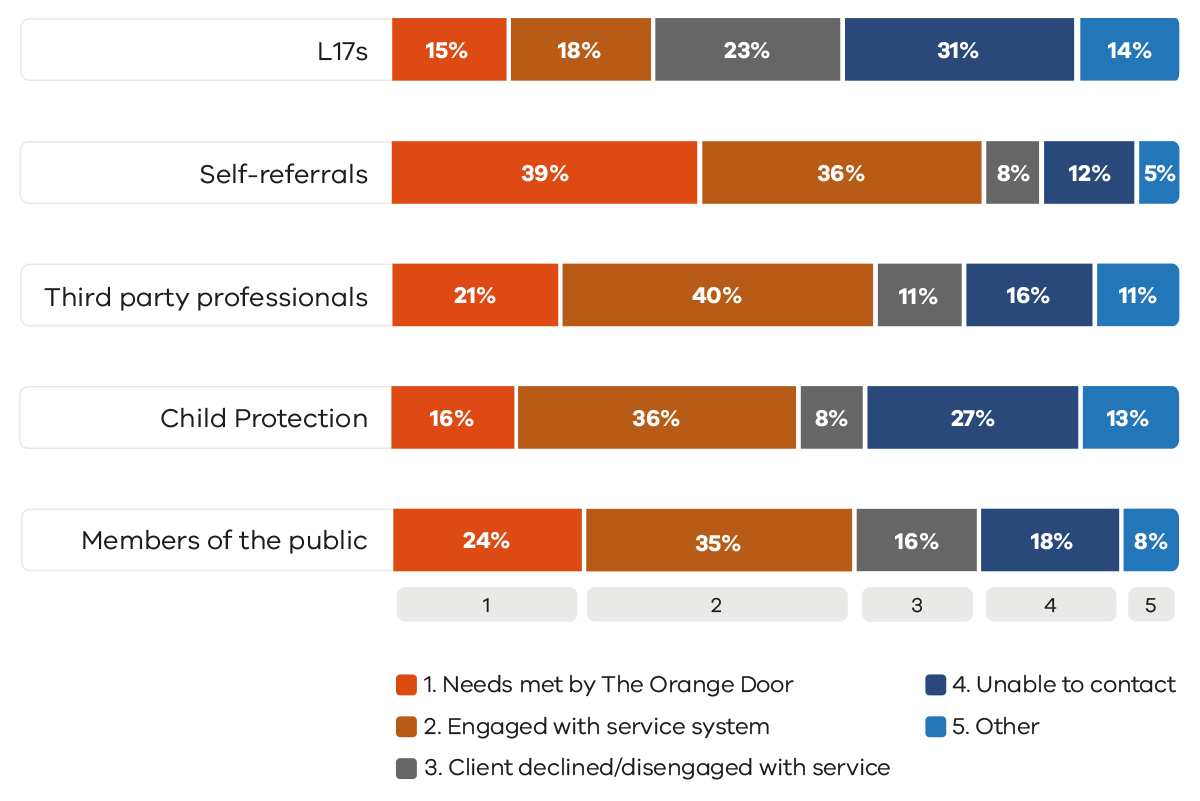 [24] Instances where practitioners are unable to contact a person occur predominantly with L17 reports where people don't respond following an incident. Practitioners in The Orange Door try calling a minimum of three times and at different times of the day to maximise the opportunity for engagement, however some people choose not to engage given The Orange Door is a voluntary service.