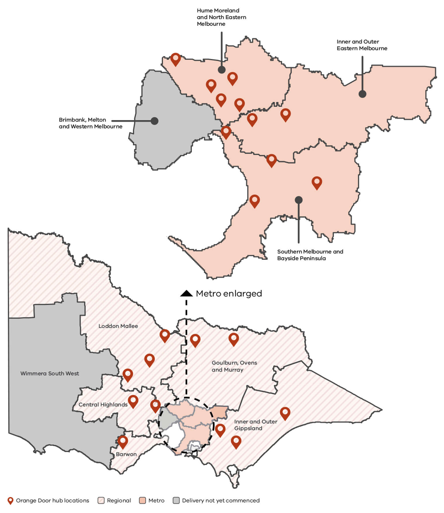 [4] The Orange Door network, Contact Us webpage, State Government of Victoria, accessed 7 November 2022. Note Brimbank Melton, Western Melbourne and Wimmera were not operational at the end of the 2021-22 financial year.