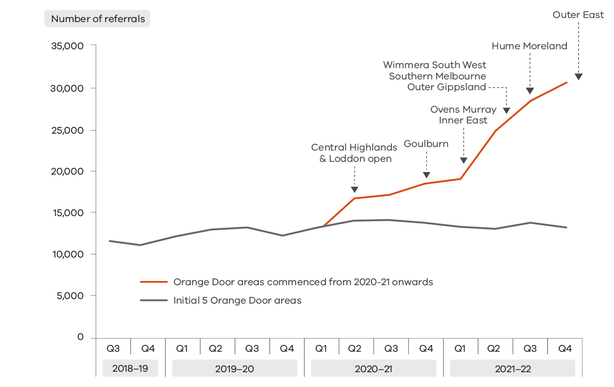 The increase in referrals was largely due to the expansion of The Orange Door network with seven new operational areas commencing in 2021-22 (Figure 5). These were Ovens Murray, Inner Eastern Melbourne, South West (Wimmera South West), Southern Melbourne, Outer Gippsland, Hume Moreland and Outer Eastern Melbourne (see also Figure 2).