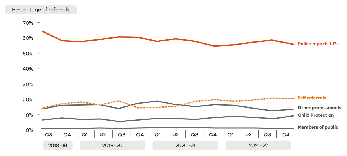 Self-referrals have progressively increased since the commencement of The Orange Door network. In 2021-22, self-referrals comprised 19.7% of all referrals, up from 17.2% in 2020-21 and 13.2% in 2018-19. This may reflect more visible and accessible entry points brought about by The Orange Door network.