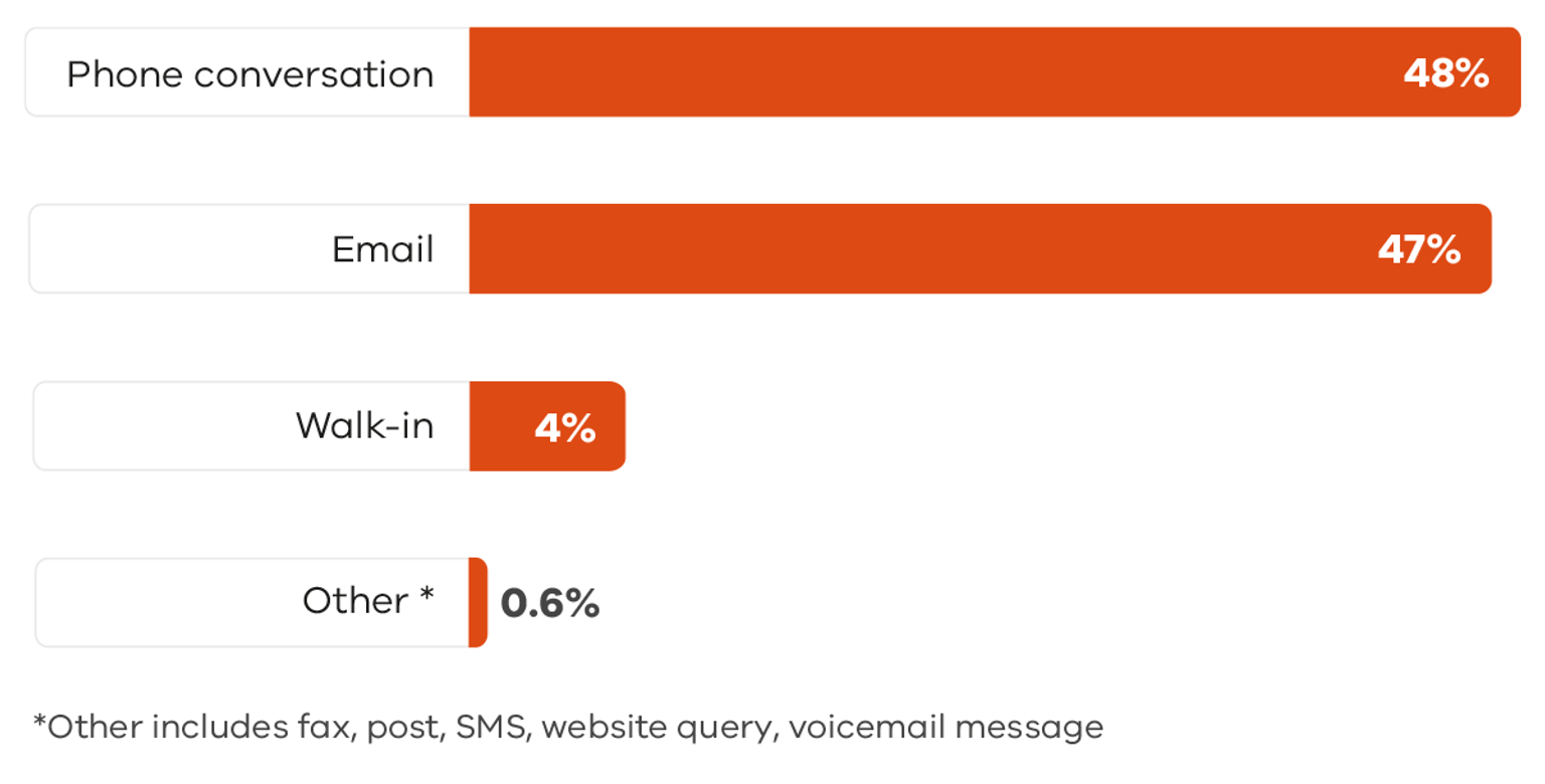 Each area has a toll-free telephone number and direct email address to facilitate ease of contact. People who make direct contact with The Orange Door themselves through a self-referral generally do so by telephone (86.4%) as do people making contact on behalf of someone they know (82.5%). Referrals received from professionals (excluding police referral reports) are mostly received by email (77.9%) or telephone (21.5%). Across all types excluding L17 police referrals, 48.5% of all referrals are received by telephone (Figure 7).