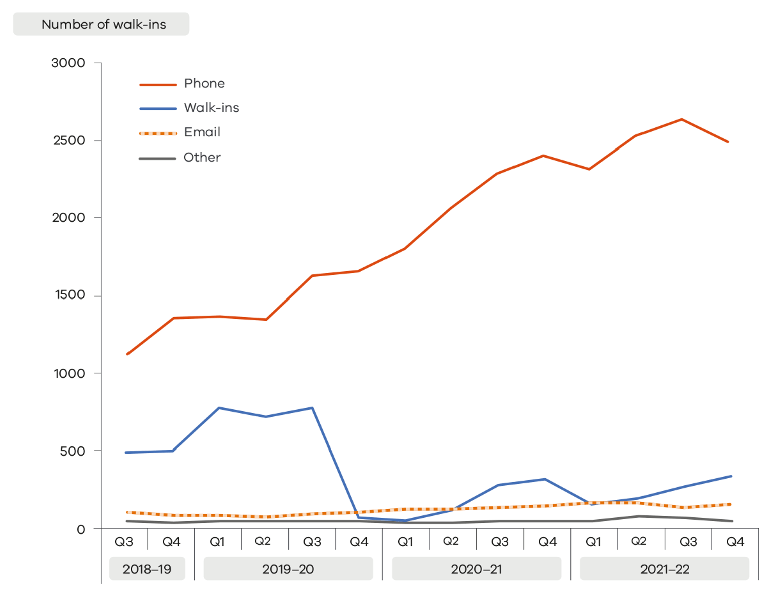 In 2021-22 across the Orange Door network, nearly 2,000 individuals and families (1.8% of all referrals) presented in person (walk-ins) to seek support, representing a 125.4% increase from walk-ins in 2020-21.