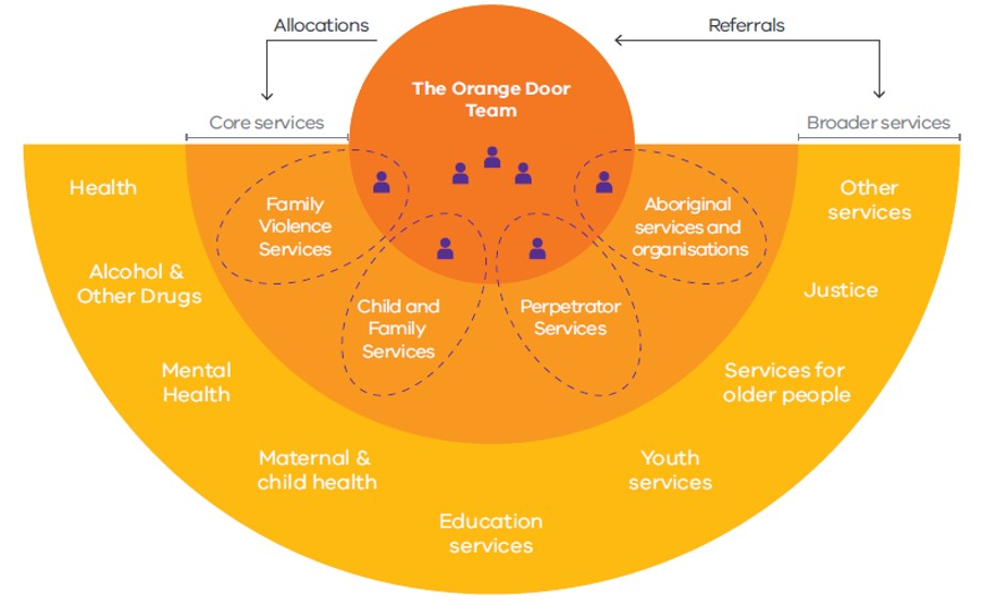 The Orange Door network assesses risk and needs, manages risk (including through safety planning), responds to crisis and immediate needs, provides brokerage where needed and supports people to get the help they need by connecting them to relevant services for ongoing support.