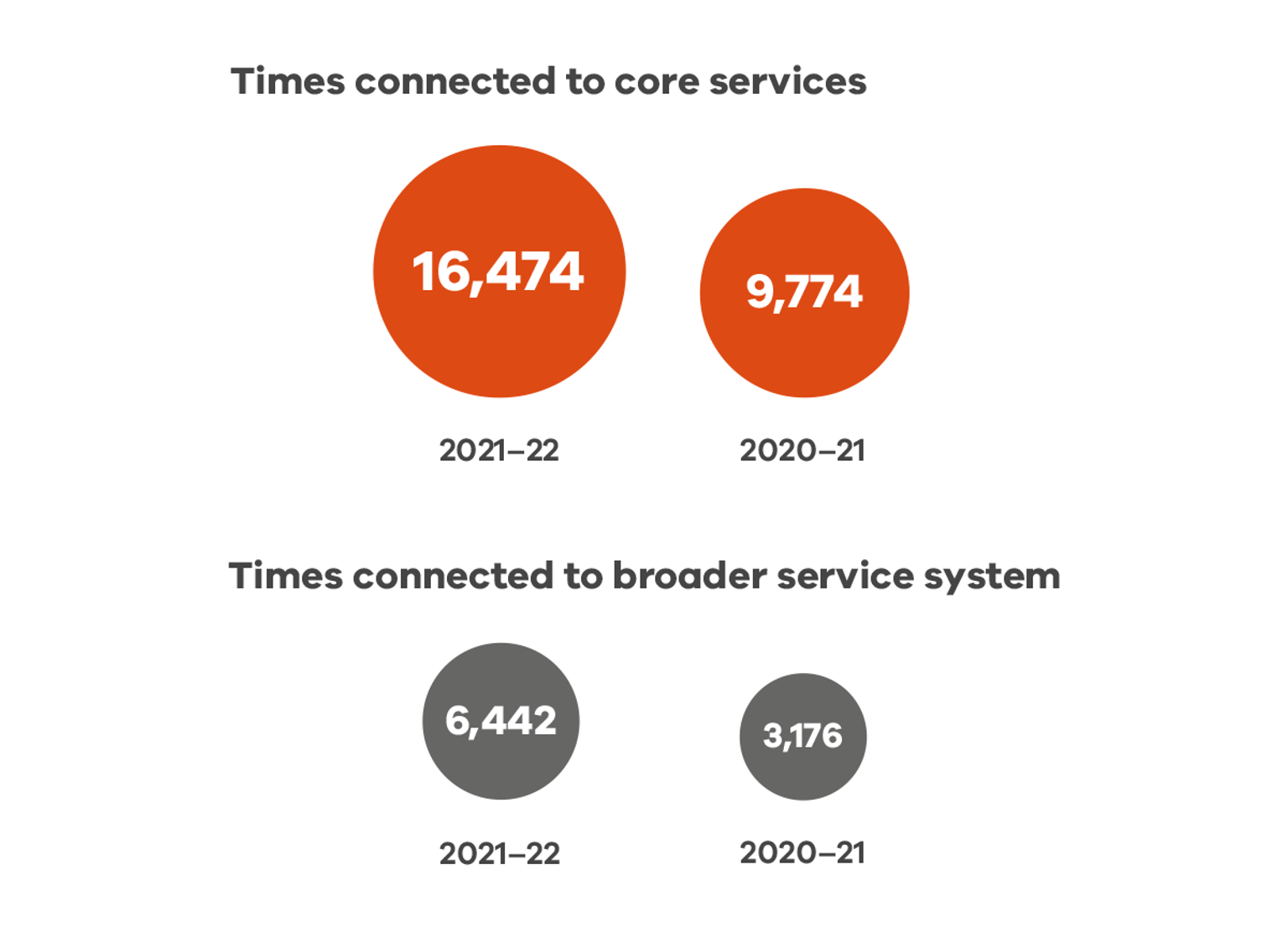In 2021-22, The Orange Door network allocated clients to a core service response 16,474 times representing a 68.5% increase from 2020-21 and connected people to broader services 6,442 times, representing a 102.8% increase from 2020-21 (Figure 15). In total, The Orange Door network made nearly 23,000 allocations and connections in 2021-22, representing a 77.0% increase compared 2020-21. Again, this increase is largely due to the commencement of new The Orange Door areas.