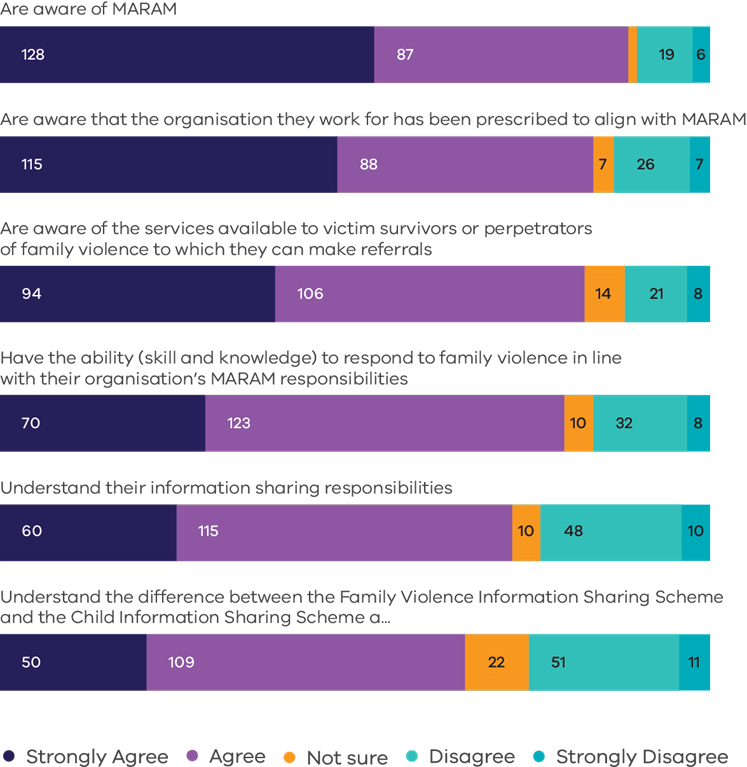 When considering the impact of these capability-building activities, the MARAM Annual Framework Survey shows that 88 per cent of leaders agree that workers in their organisation are aware of MARAM, and 79.4 per cent can respond to family violence.