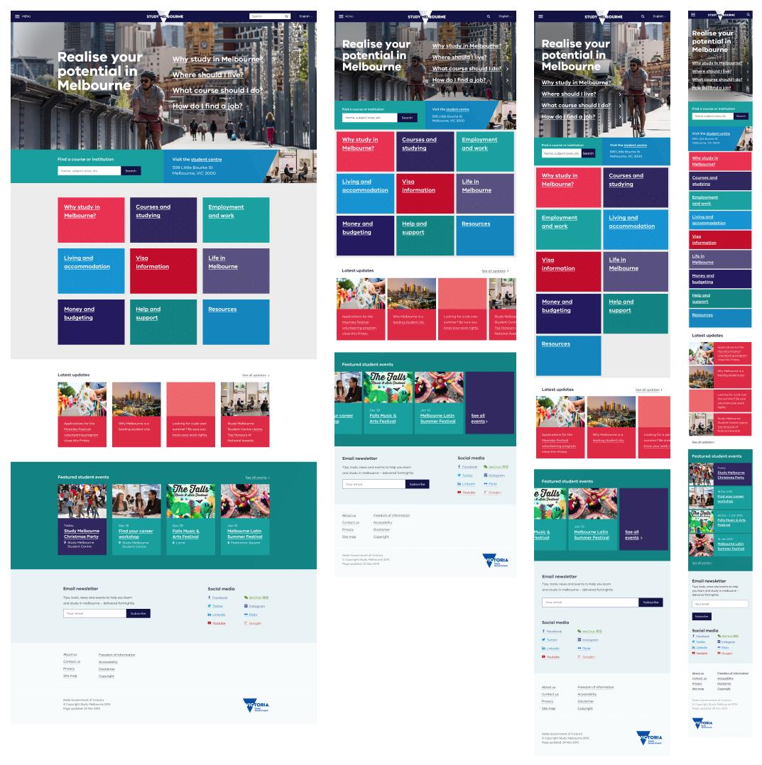 Above: An example of how a homepage may respond from desktop, to tablet landscape, to tablet portrait and finally, mobile.