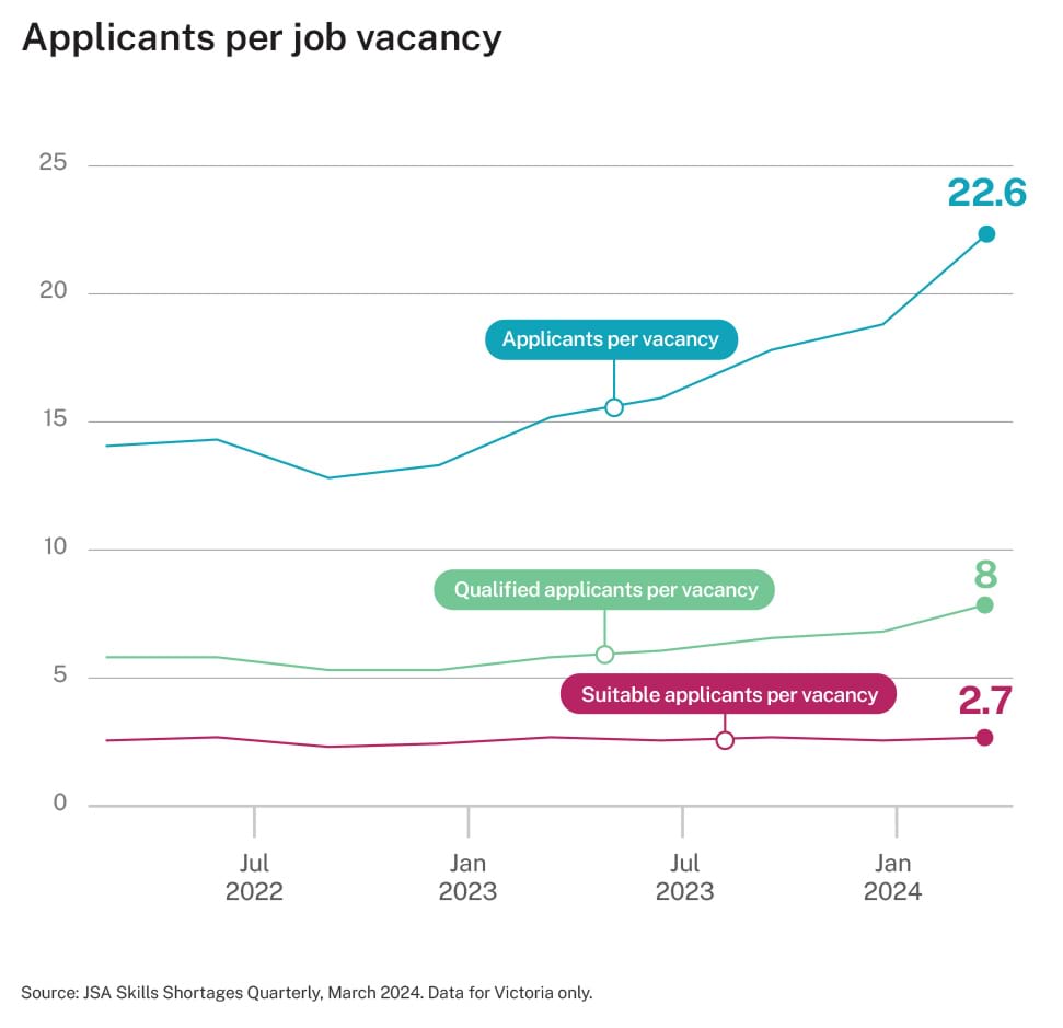 - The average number of applicants per job vacancy has increased from 13 in September 2022 to 23 in March 2024.