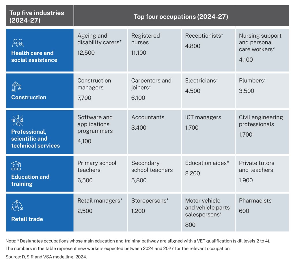 The fastest growing industries in Victoria over 2024-27 (health care and social assistance and construction) usually require VET qualifications for occupations in demand including ageing and disability carers (12,500), and carpenters and joiners (6,100).