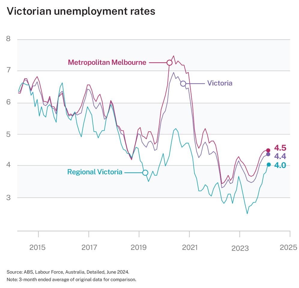 - The unemployment rate in metropolitan Melbourne has increased to 4.5 per cent in June 2024. The unemployment rate for regional Victoria remains historically low at 4 per cent, driven by relatively stronger regional jobs growth over recent years compared with metropolitan Melbourne.