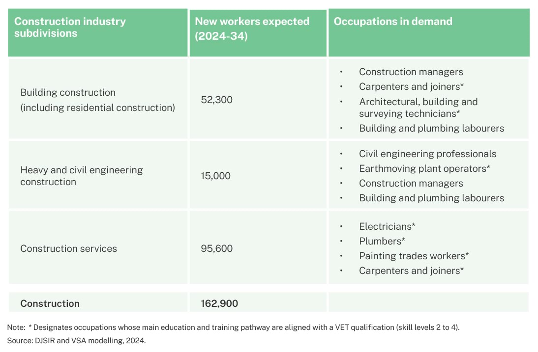 The fastest growing industries in Victoria over 2024-27 (health care and social assistance and construction) usually require VET qualifications for occupations in demand including ageing and disability carers (12,500), and carpenters and joiners (6,100).