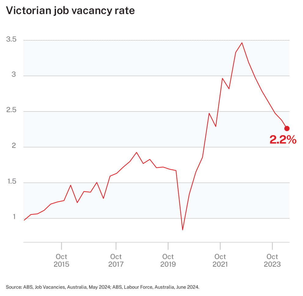 - With 172,000 Victorians unemployed and 87,000 job vacancies in May 2024, there are now two unemployed Victorians for each vacancy. This is higher than in early 2022 where it was close to one unemployed Victorian for each job vacancy.