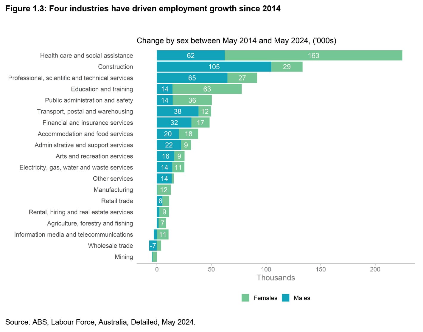 Four industries have driven employment growth in Victoria since 2014: health care and social assistance; construction; professional, scientific and technical services; and education and training. These four industries accounted for 62 per cent of employment growth over the last 10 years, and account for 43 per cent of total Victorian employment in May 2024. For nine of the 19 industries, growth in female employment accounted for more than half of employment growth over the same period.
