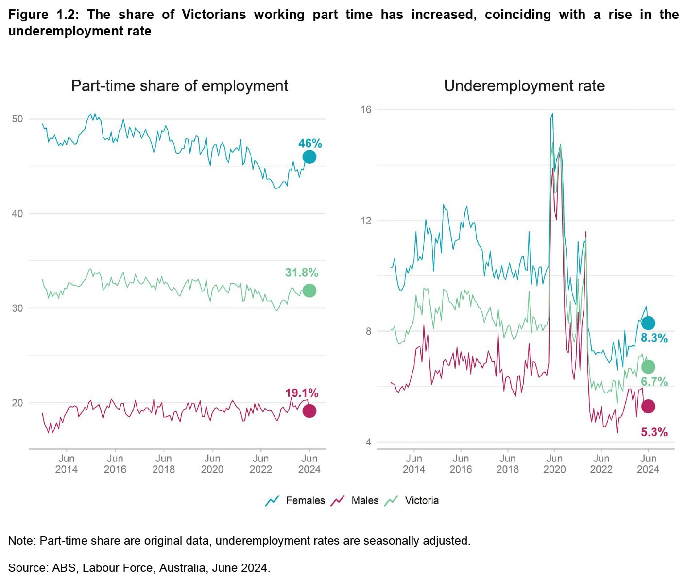 Figure 1.2: The share of Victorians working part time has increased, coinciding with a rise in the underemployment rate
