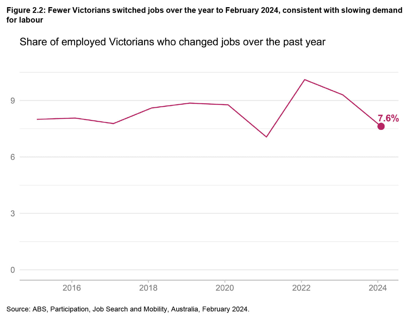 Around 280,000 Victorians changed jobs over the year to February 2024, representing 7.6 per cent of employed people. This has declined from a high of 10.1 per cent in 2022, consistent with slowing demand for labour. Of the Victorians who changed jobs over the year to February 2024, around half changed industry and around 40 per cent changed occupation.